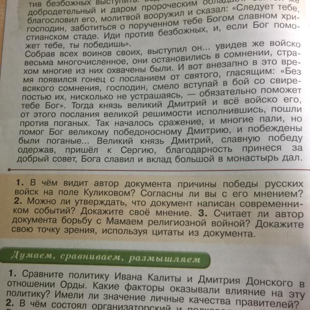 hawkf1mv1. Автор документа видит причину победы русских войск на Куликовом поле в том, что русские бились с воодушевлением, зная, что бьются за правое дело и их поддерживает Бог. Конечно же, нельзя отрицать роль православного единства русских людей в этой победе, но разбить войско Мамая помогли в первую очередь храбрость и стойкость русских людей, полководческий и организаторский талант Дмитрия Донского.