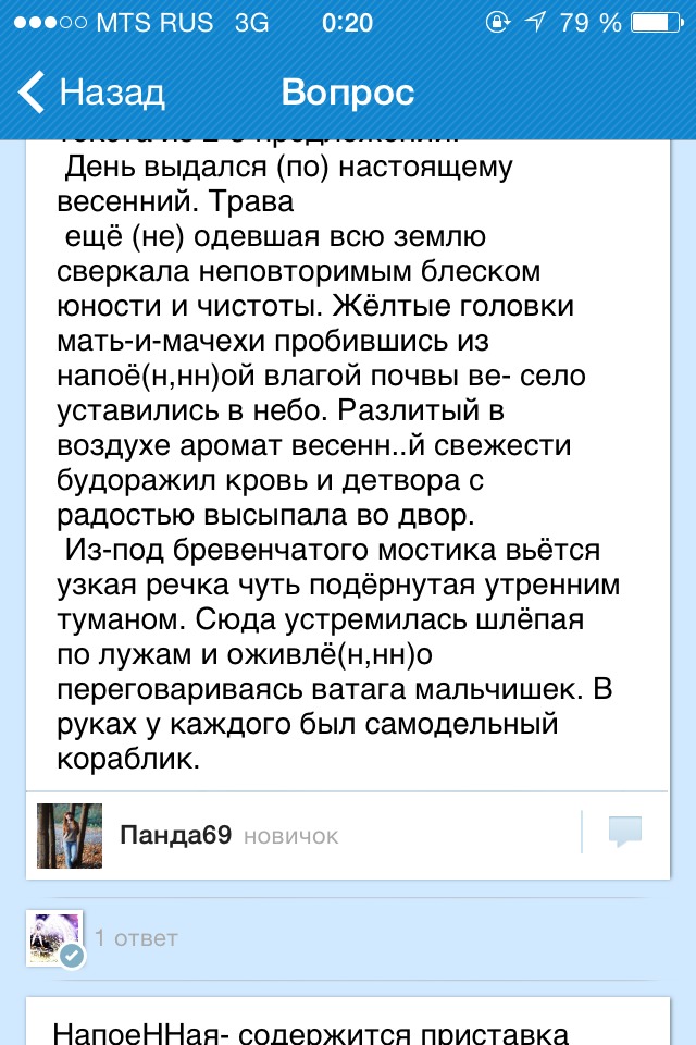 чистоты. (Читатель уже начинает внутренне улыбаться). Мы видим "желтые головки мать-мачехи уставились в небо". Уставились,значит , устремлены вверх их стройные стебельки.Мы ощущаем "аромат весенней свежести" ,и соглашаемся с тем,что этот аромат может "будоражить кровь". Читатель любуется детьми,которые "высыпали во двор",это весна принесла и им энергию."Река,подернутая утренним туманом" вызывает только приятные воспоминания о рыбалке и мечты о будущих вылазках на реку.Всего семь предложений,но настроение стало светлым,радостным,праздничным и немного восторженным.